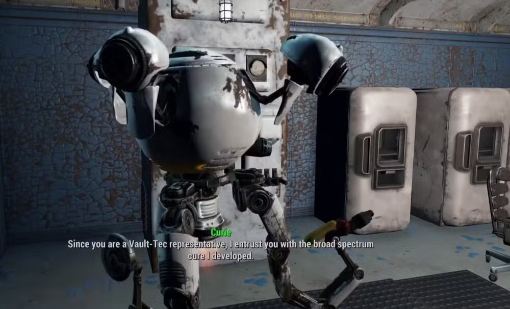 In Vault 81, Curie begins as a robot, Miss Nanny, who spends her time in a lab working on irradiated goo. Take off that pod, and she replaces her French-accented robo-chassis with a synth body – talk about a glow-up. She is nothing but innocent curiosity, fawning over any radstorm or deathclaw as though it were a Nobel discovery. Curie is an optimist in a cynical world.