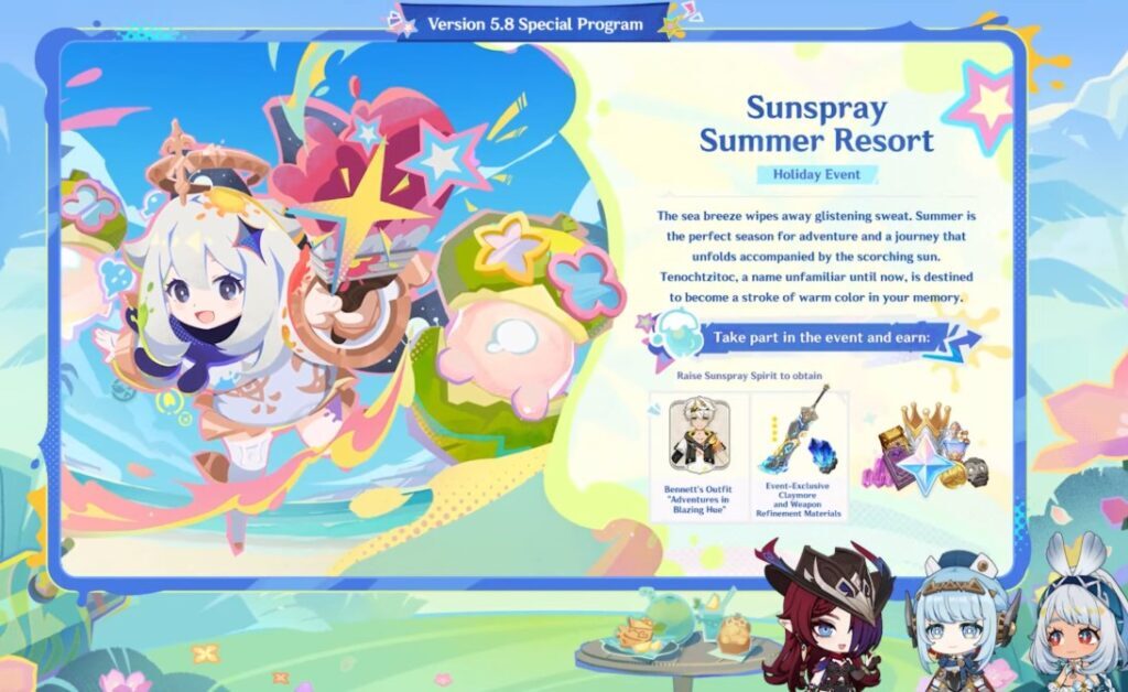 - Sunspray Summer Resort. Mini-games (platforming, sharpshooting, rhythm combat) with rewards like Bennett’s skin, Flame-Forged Insight, and 1,000 Primogems;